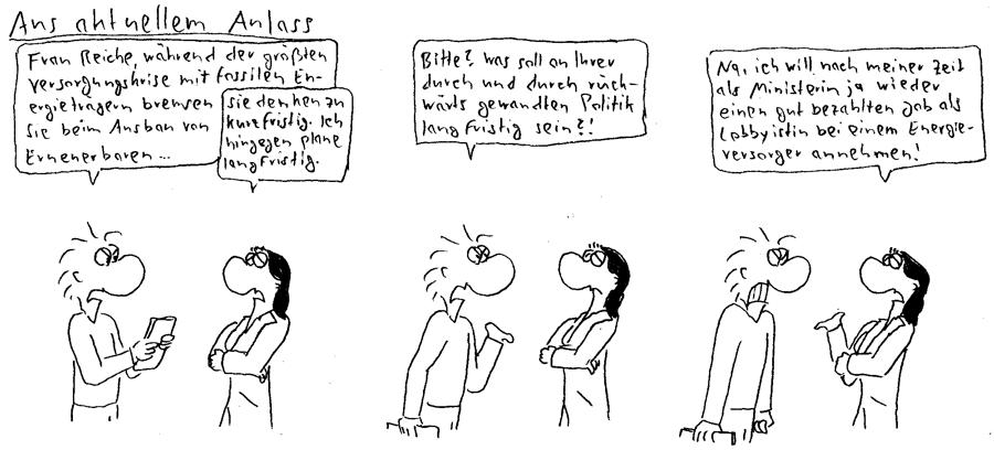 05.04.2026Olli's Kommentar:In der Regel erwartet man eine gewisse "Abklingzeit", bevor Politiker Posten als Lobbyisten übernehmen. Frau Reiche sieht da aber offenbar keinen Unterschied und damit gilt diese Regel für sie natürlich nicht.
